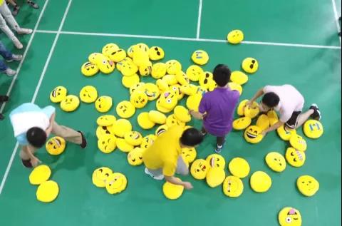 地面上放滿表情包枕,運(yùn)動(dòng)員們按照教練的指示尋找、搶奪枕頭;每輪每隊(duì)派出5人參賽。