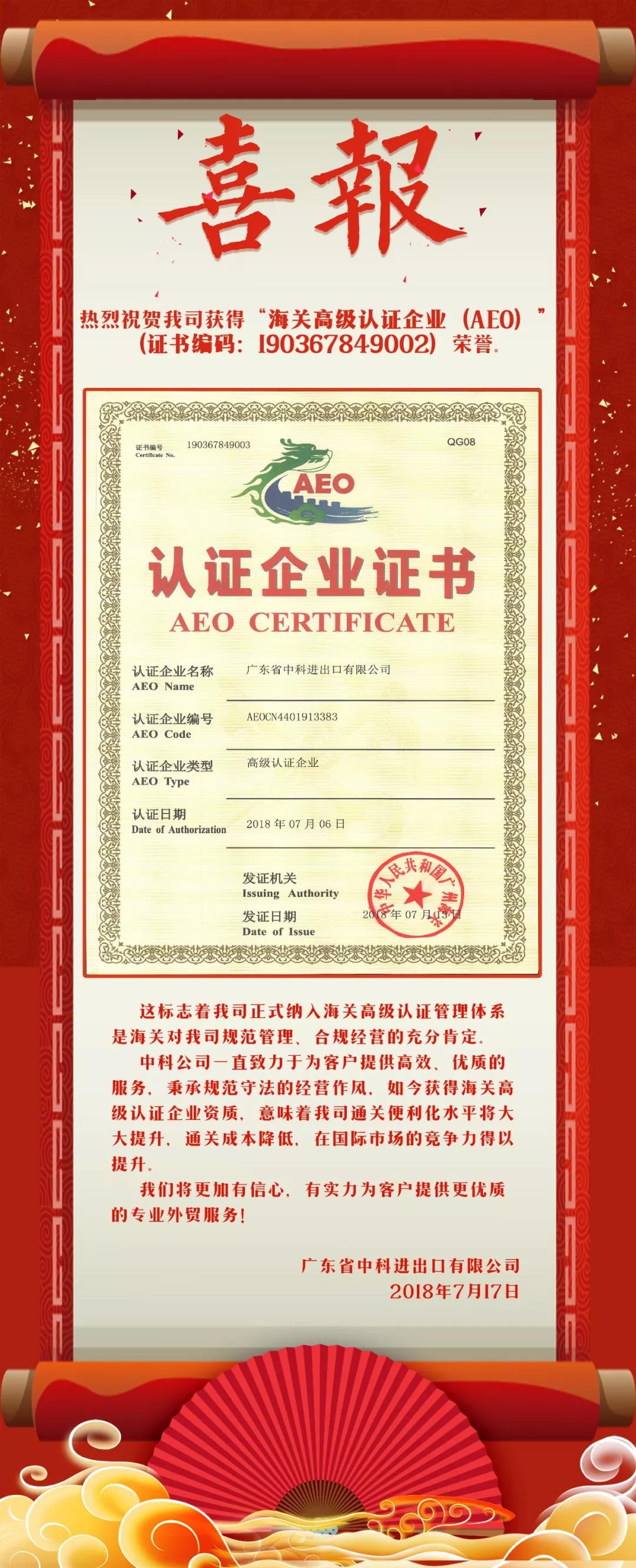 熱烈祝賀我司獲得“海關(guān)高級(jí)認(rèn)證企業(yè)(AEO)”榮譽(yù)