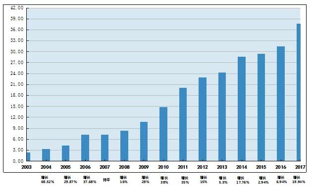 數(shù)據(jù)分析圖一:《中科公司2003-2017年營業(yè)額數(shù)據(jù)圖》(單位:億元)