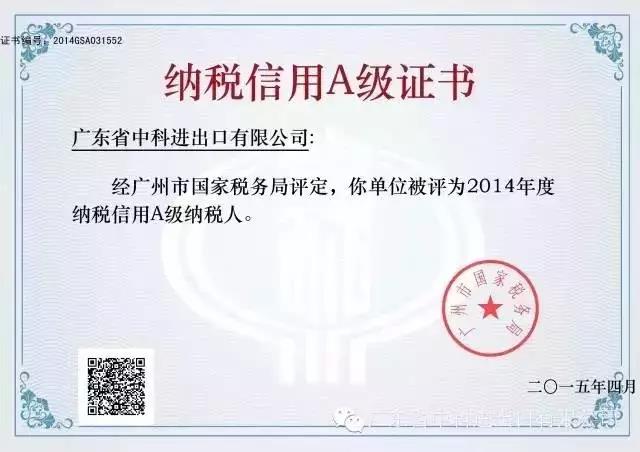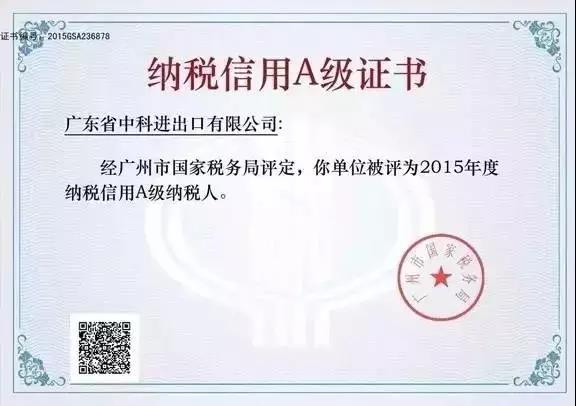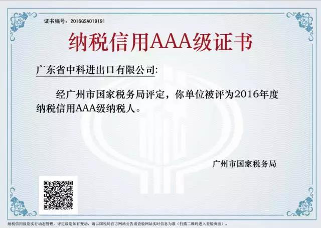 我司被評(píng)為2016年度納稅信用AAA級(jí)企業(yè),是廣州市國(guó)家稅務(wù)局對(duì)我司的高度贊揚(yáng)和認(rèn)可。今后我司將在銀行、稅務(wù)、工商等部門享受特殊通道,能更便利快捷地辦理各項(xiàng)業(yè)務(wù),為中科的客戶提供更高效、優(yōu)質(zhì)的服務(wù)。